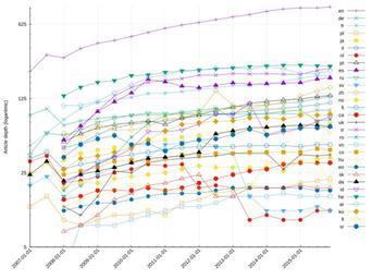 Keywords: Article depth.svg de Table of https //meta wikimedia org/wiki/Wikipedia_article_depth 10_000 2B_articles 2015-11-17 own StefanPohl other versions Created with Gnuplot name 'article_depth' reset get_dt i i 0 1 i 1 '-' i 2 ' ' '_' do fori 0 3 set style line 1+10 i lt 1 dt get_dt i lw 1 lc rgb ' ff3333' set style line 2+10 i lt 1 dt get_dt i lw 1 lc rgb ' 00ccff' set style line 3+10 i lt 1 dt get_dt i lw 1 lc rgb ' 66ff33' set style line 4+10 i lt 1 dt get_dt i lw 1 lc rgb ' cccccc' set style line 5+10 i lt 1 dt get_dt i lw 1 lc rgb ' 009999' set style line 6+10 i lt 1 dt get_dt i lw 1 lc rgb ' ff9933' set style line 7+10 i lt 1 dt get_dt i lw 1 lc rgb ' 000000' set style line 8+10 i lt 1 dt get_dt i lw 1 lc rgb ' 336600' set style line 9+10 i lt 1 dt get_dt i lw 1 lc rgb ' 9900cc' set style line 10+10 i lt 1 dt get_dt i lw 1 lc rgb ' cc9999' set grid lc rgb ' AAAAAA' lt 2 dt ' ' lw 75 set border 3 set tics nomirror scale 5 set autoscale fix set term svg size 1200 900 fsize 16 set key outside right set xdata time set timefmt ' d m Y' set format x ' Y- m- d' set xtics rotate by 45 right set ytics 5 set yrange 5 set logscale y set ylabel 'Article depth logaritmic ' set output name ' svg' plot fori 2 31 name ' txt' u 1 i w lp title columnhead i unset output scroll Date en de fr pl ja it nl pt es ru sv zh no fi ca uk tr ro vo cs hu eo sk da id he ar ko lt sr 17 11 2015 906 97 204 22 72 114 11 133 195 130 11 159 35 46 31 37 241 79 15 41 59 17 18 68 84 251 229 89 20 68 01 07 2015 888 97 205 21 71 109 11 130 190 125 12 147 34 46 31 36 229 77 15 42 76 17 18 70 76 253 214 87 31 66 01 01 2015 887 89 193 20 69 105 9 123 176 115 11 131 32 44 31 37 210 97 15 39 97 18 19 70 65 257 214 87 31 66 01 07 2014 868 90 181 18 68 101 9 121 174 113 11 114 26 45 30 27 211 94 16 39 99 18 18 69 60 256 237 80 31 63 01 01 2014 824 90 172 18 66 98 10 117 172 109 11 108 28 45 27 38 214 90 15 39 100 18 18 67 56 253 248 82 31 57 01 07 2013 769 89 164 19 64 95 9 112 170 106 15 100 28 45 26 38 212 88 15 39 100 18 18 66 112 249 235 82 18 64 01 01 2013 731 89 165 17 61 91 18 103 175 104 38 108 28 44 24 38 214 81 15 38 99 18 15 62 88 242 243 77 17 57 01 07 2012 688 88 157 16 58 89 19 96 166 99 44 148 28 44 22 36 207 101 13 38 98 17 15 58 89 236 241 76 16 52 01 01 2012 648 89 151 14 56 85 18 88 158 92 50 90 29 44 20 35 207 97 12 37 92 16 24 39 72 231 230 74 17 51 01 07 2011 613 89 145 13 54 81 30 82 163 91 48 83 27 43 18 34 192 93 12 37 90 16 22 36 63 227 225 71 17 47 01 01 2011 572 87 140 10 51 77 29 71 179 90 46 80 25 41 17 33 185 86 11 34 86 16 20 35 61 220 208 62 17 40 01 07 2010 522 88 139 11 49 75 30 77 189 91 35 68 24 39 18 31 177 73 10 32 81 15 19 34 61 208 197 51 19 47 01 01 2010 478 86 128 10 46 71 27 74 141 87 31 63 23 37 17 25 159 54 9 33 71 14 16 31 42 205 167 43 19 46 01 07 2009 440 84 121 10 43 66 25 71 116 81 28 63 22 35 17 26 132 36 8 32 70 13 14 28 35 184 142 39 17 56 01 01 2009 413 81 115 9 41 57 23 66 94 74 24 71 20 32 17 15 95 30 8 28 64 13 10 26 30 177 117 36 15 52 01 07 2008 368 77 101 8 38 47 21 58 69 63 19 56 20 30 15 10 66 25 8 26 51 12 8 24 24 159 108 34 14 46 01 01 2008 302 70 79 9 33 43 20 49 51 56 15 59 18 27 14 12 43 17 3 24 39 11 7 21 20 132 107 27 12 35 01 07 2007 320 100 59 15 - - 36 - - 59 23 - 31 39 - - - - - - - - - 32 - - - - - - 01 01 2007 224 87 45 12 - - 32 - - 37 19 - 25 34 - - - - - - - - - 24 - - - - - - cc-zero Uploaded with UploadWizard Article depth