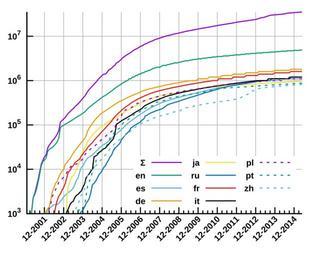 | Keywords: Articlecount topten wikipedia.svg de Artikelanzahl logarithmisch der zum Plotzeitpunkt zehn größten Wikipedias 2015-06-13 own Daten von https //stats wikimedia org/EN/TablesArticlesTotal htm StefanPohl other versions v reset set term svg lw 2 fname 'Arial bold' fsize 16 set grid xtics ytics lt 1 lc rgb 0xAAAAAA lw 5 set key bottom right maxrows 5 set border 3 set tics nomirror set xtics rotate by 45 right unset mytics set xdata time set timefmt ' b Y' set format x ' m- Y' set format y '10 T' set autoscale fix set logscale y set yrange 1000 set xtics 60 60 24 365 get_dt i i > 9 2 1 set output 'wp_articlecount svg' plot fori 2 12 'wp_articlecount txt' using 1 i w l dt get_dt i title columnhead i set output 'wp_articlecount2 svg' plot fori 2 15 'wp_articlecount2 txt' using 1 i w l dt get_dt i title columnhead i unset output cc-zero Uploaded with UploadWizard Wikipedia trends |