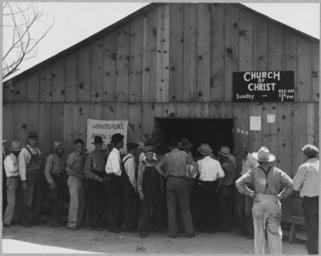 | Keywords: Arvin, Kern County, California. Line up for state relief pay day. Shows exterior of building. This b . . . - NARA - 521650.jpg Scope and content Full caption reads as follows Arvin Kern County California Line up for state relief pay day Shows exterior of building This building is used for the worker's alliance meetings Church of Christ services and headquarters for distribution of S R A checks This is an area of rapidly growing shacktown communities most of the relief clients pictured here inhabit these new rural slums General notes 521650 Local identifier 83-G-41409A Department of Agriculture Bureau of Agricultural Economics Division of Economic Information ca 1922 - ca 1953 NARA-Author Lange Dorothea 1895-1965 Photographer 1372774 <br /> Still Picture Records Section Special Media Archives Services Division NWCS-S National Archives at College Park 8601 Adelphi Road College Park MD 20740-6001 1940-04-13 Record group Record Group 83 Records of the Bureau of Agricultural Economics 1876 - 1959 Record group ARC 412 Photographic Prints Documenting Programs and Activities of the Bureau of Agricultural Economics and Predecessor Agencies compiled ca 1922 - ca 1947 documenting the period ca 1911 - ca 1947 Series ARC 521048 File unit File unit ARC Variant control numbers NAIL Control Number NWDNS-83-G-41409A Other versions <gallery> File Arvin _Kern_County _California _Line_up_for_state_relief_pay_day _Shows_exterior_of_building _This_b_ _ _ _-_NARA_-_521650 tif tif File Arvin _Kern_County _California _Line_up_for_state_relief_pay_day _Shows_exterior_of_building _This_b_ _ _ _-_NARA_-_521650 jpg jpg </gallery> NARA-cooperation PD-USGov Dorothea Lange Arvin California Wooden churches in California Arvin 1940 in California NARA images of Kern County California Black and white photographs of California |