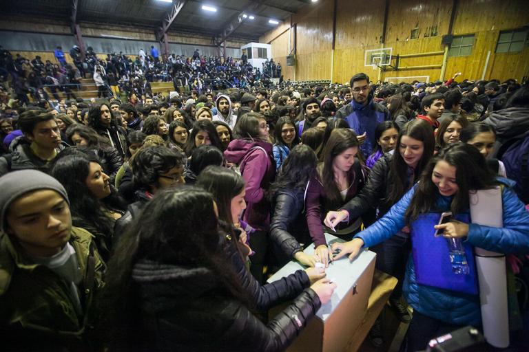 Keywords: people crowd Este proceso se realizó en el contexto de una asamblea general a la que llamó la Mesa Ejecutiva de la Federación de Estudiantes de la UMAG (FEUM) y contó con una masiva asistencia de alumnos, quienes reunidos en el Gimnasio del campus central, emitieron su preferencia a favor o en contra de sumarse a esta movilización a la que ya se ha plegado más de una decena de universidades a lo largo del país. Este proceso se realizó en el contexto de una asamblea general a la que llamó la Mesa Ejecutiva de la Federación de Estudiantes de la UMAG (FEUM) y contó con una masiva asistencia de alumnos, quienes reunidos en el Gimnasio del campus central, emitieron su preferencia a favor o en contra de sumarse a esta movilización a la que ya se ha plegado más de una decena de universidades a lo largo del país.
