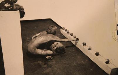| Keywords: Ashes to Apple.jpg en CalArts live performance piece on Ash Wednesday 1972 Ashes and Apples A live version of the Zen principal of throwing a dart everywhere in the room except at the target with bites from several apples as a reward every time the dart misses the dart board Mark Wilson is completely covered with ashes Performed behind a screen while drumming on a wooden log Photo originally taken by Michael Pliskin own Sgerbic 2011-03-20 Cc-zero CalArts Mark Edward Performance art | ||||