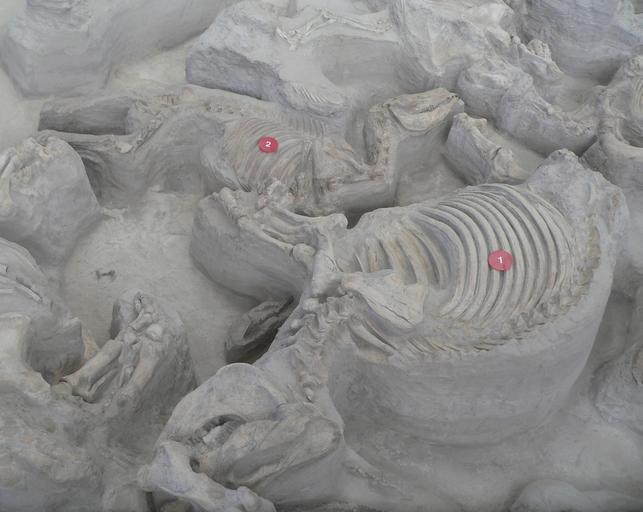 Keywords: Ashfall Fossil Beds - Teleoceras and Cormohipparion.jpg en Ashfall Fossil Beds in Antelope County Nebraska According to nearby signs the 1 marker is on a young adult Teleoceras major nicknamed Tusker ; its estimated age is 8-9 years with wisdom teeth beginning to come in; the femur across its face near the bottom of the photo was probably taken from a neighboring carcass by a large predator The 2 marker is on the remains of a three-toed horse Cormohipparion occidentale 2012-09-09 14 26 00 own Ammodramus cc-zero Pictures by Ammodramus Taken with Panasonic Lumix DMC-FZ20 Ashfall Fossil Beds Uploaded with UploadWizard Teleoceras Equidae fossils |