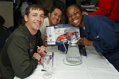 | Keywords: Ashton Lewis.jpg 050518-N-6484E-001 Atlantic Ocean May 18 2005 - Aviation Machinist's Mate Airman Jennifer Singleton poses for a photograph with NASCAR Busch Series Drivers Ashton Lewis left of the U S Marines No 25 Ford and David Stremme center of the U S Navy No 14 Dodge during an autograph session aboard the Nimitz-class aircraft carrier USS Theodore Roosevelt CVN 71 The Roosevelt is currently at sea conducting routine carrier operations U S Navy photo by Photographer's Mate Airman Stephen Early RELEASED http //www navy mil/view_image asp id 24480 2005-05-18 U S Navy photo by Photographer's Mate Airman Stephen Early RELEASED 2 All information on this site is public domain and may be distributed or copied unless otherwise specified Use of appropriate byline/photo/image credits is requested http //www navy mil/privacy html PD-USGov NASCAR drivers Ashton Lewis Jr David Stremme |