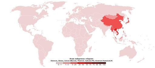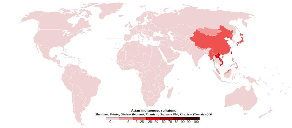 | Keywords: Asian indigenous faiths (Shenism + Shinto + Muism + Thanism + Sadsana Phi + Kiratism) by percentage (Pew Research Center).png A map showing the followers of the ethnic religions of East Asian countries Chinese Shenism Japanese Shinto Korean Sinism or Muism Vietnamese Thanism Laotian Sadsana Phi Nepalese Kiratism or Yumaism and data for Mongolian Bhutanese and Burmese ethnic religions by percentage in each country Note that the Chinese folk religion includes Taoism Self-made Based on http //www pewforum org/files/2014/01/global-religion-full pdf Pew Research Center Global Religious Landscape 2010 data for folk religions Further information available in articles of Wikipedia discussing the topic Chinese folk religion; Korean shamanism; Shinto; Vietnamese folk religion; Sadsana Phi; Kiratism; Mongolian shamanism; Religion in Bhutan; religion in Burma; religion in China; religion in Japan; religion in Korea; religion in Laos; religion in Malaysia; Religion in Mongolia; religion in Nepal; religion in Singapore; religion in Taiwan; religion in Vietnam; religion in Xianggang 2014-03-15 User Khny Allowed to copy and distribute Religion maps of the world Kiratism |