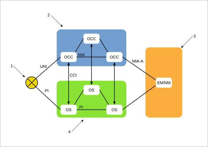 Keywords: ASON Logical Structure.svg en Automatically Switched Optical Network ASON logical structure 1 Client Device AP Router ATM Switch 2 Control plane 3 Management plane 4 Transport plane OCC - Optical Connection Controller OS - Optical Switch UNI - User to Network Interface NNI - Network to Network Interface NMI-A - Network Management Interface for ASON Control Plane CCI - Connection Control Interface PI - Physical Interface pl Schemat logiczny sieci ASON 1 Urządzenie klienta Router AP Switch ATM 2 Płaszczyzna Kontrolna 3 Płaszczyzna Zarządzania 4 Płaszczyzna transportowa OCC - Kontroler łącza optycznego OS - Switch optyczny UNI - Interfejs Użytkownik - Sieć NNI - Interfejs Sieć - Sieć NMI-A - Interfejs zarządzania siecią dla płaszczyzny kontrolnej CCI - Interfejs kontroli połączeń PI - Interfejs fizyczny Praca własna na podstawie pliku załadowanego przez pl wikipedysta Craven User Harkonnen2 30 10 2009 oryginał 27 01 2008 WPGW vector image Network diagrams |