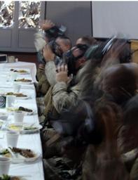 | Keywords: ASP Marines Raise Morale With Mess Night DVIDS26098.jpg en The Marines at the head table of the field mess night at Al Asad Iraq July 1 struggle furiously to get their gas masks on when a pungent smell hit their nostrils and Gas Gas Gas was called out at the banquet Being a tradition that has lived since the days of King Arthur and the Knights of the Round Table mess night is a banquet laced with ceremony and laughs for Marines to honor and recognize the Marines who came before them as well as to build onto their own camaraderie 2006-07-03 Cpl James Hoke https //www dvidshub net/image/26098 26098 2006-07-18 08 40 AL ASAD IQ PD-USGov Gas masks Images from DoD uploaded by Fæ |