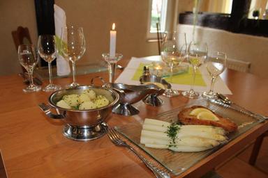 Keywords: asparagus asparagus dish schnitzel potatoes butter hollandaise gedeckter table