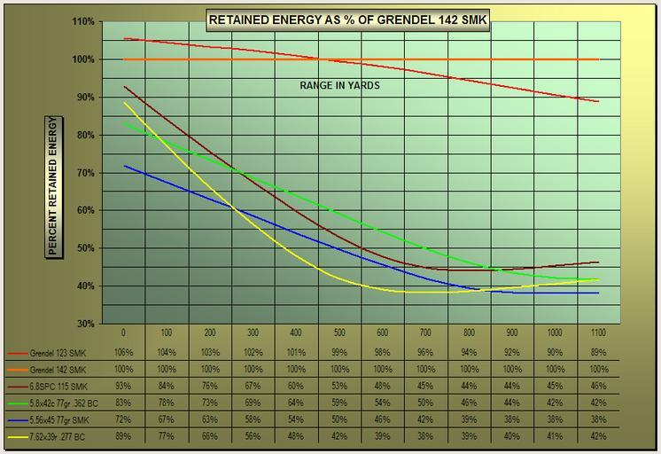 | Keywords: AssaultRifleCartridgeComparisonChart.PNG Comparison of various assault rifle cartridges all loaded with pressure-safe loads and all with the Sierra MatchKing bullets to enable a consistent basis for comparison The SMK was chosen because it is identical to or very close in construction to current US DOD bullets which have been certified as Hauge Legal for combat by the JAG The 7 62x39 was loaded with a Spitzer bullet as no SMK was available I do not believe this changed any conclusions regarding its overall performance relative to the other cartridges The 5 8x42 Chinese round's BC and velocity was calculated based on my own estimates and extrapolations as well as photographs and other information supplied by Stan Crist and several other ballistics experts who I wish to thank at this time This graphic was in part an attempt to quantify Stan's recent claim in his Infantry Magazine piece <blockquote> The 6 8x43mm and 6 5x38mm are the most capable upgrades but they are also the most expensive The 6 8mm SPC would provide a substantial improvement in close combat capability which was its stated design purpose However the streamlined projectiles fired by the 6 5mm Grendel deliver vastly superior all-around performance combining improved terminal effects with greatly enhanced capability to reach out and touch someone at long distance </blockquote> The bulk of the information contained in this graphic can be easily obtained from pressure-safe reloading tables on Hodgdon's online reloading site and from Sierria Bullet's online tables The idea behind expressing this information as a percentage of the 6 5 Grendel's retained energy was to make for quick comparisons Obviously the choice of which cartridge to use as a baseline comparison does not affect the relative performance of the cartridges in any way These percentages were retained in table form at the bottom of the graph so at any range one can easily compare the retained energy of any of the various cartridges There is an extended discussion of the methodology and estimation techniques used in the construction of this graphic on the 65Grendel com website on the Wiki Page threadbase This discussion and the ancillary offline emails attendant with it easily exceeded the total size of the Wiki Assault Rifle page so even a summary discussion would be unacceptably large within the context of the Wiki Assault Rifle page Stanley C Crist http //www thedonovan com/archives/gunstuff/12_fa02 pdf Small Arms Ammunition for the 21st Century Hight-Performance Alternatives to the 5 56 NATO Round pdf Infantry magazine May-June 2006 en wikipedia 2006-11-21 Solidpoint wikipedia en Solidpoint original upload log page en wikipedia AssaultRifleCartridgeComparisonChart PNG 2006-11-21 05 48 Solidpoint 908×623×8 103445 bytes <nowiki>Comparison of various assault rifle cartridges all loaded with pressure-safe loads and all with the Sierra MatchKing bullet to enable a consistent basis for comparison The 7 62x39 was loaded with a Spitzer bullet as no SMK was available I do not believe</nowiki> 2006-11-21 05 45 Solidpoint 908×623×8 103445 bytes <nowiki>Comparison of various assult rifle cartridges all loaded with pressure-safe loads and all with the Sierra MatchKing bullet to enable a consistent basis for comparison The 7 62x39 was loaded with a Spitzer bullet as no SMK was available I do not believe </nowiki> Ballistics of cartridge |