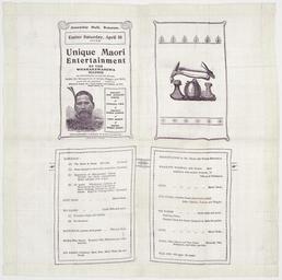 | Keywords: text writing drawing sketch Shows four panels, with title panel art top left, Maori gourds and axes at the top right, and the programme of the concert in the lower two panels. Items also included a presentation to Dr Craig and Nurse Schofield. Programme included tableaux of everyday Maori life, a part song, poi games (by Guide Bella and party), Mate Mate (ancient catch game by Tiki and Hara), Haka (by Waretini, Tiki, Hekemaru et al), Poi games by children (Mere, Rato, Muri, Tetai, Ka and Rangi), Whakatu Waewae, with taiaha (Tiki and Hekemaru), Song, Titi Torea (stick game - with Bella, Ngahua, Tatiana and Maggie), Poi games (Bella et al), Song, Haka (Waretini, Tiki, Hekemaru, et al). Quantity: 1 colour photo-mechanical print(s). Physical Description: Letterpress on silk handkerchief, 407 x 407 mm. Provenance: From the collection of Kenneth Webster. Rotorua chronicle (Newspaper). Assembly Hall, Rotorua :Easter Saturday, April 10. Unique Maori Entertainment by the Whakarewarewa Maoris, 50 performers in native attire, under the management of Guides Maggie and Bella. Ancient and stirring hakas, graceful pois, ancient Maori games, parts songs, weird Maori music. Chronicle Print, Rotorua . [Silk handkerchief. 1908].. Ref: Eph-D-MAORI-CONCERTS-1908-01. Alexander Turnbull Library, Wellington, New Zealand. natlib.govt.nz/records/23044424 Shows four panels, with title panel art top left, Maori gourds and axes at the top right, and the programme of the concert in the lower two panels. Items also included a presentation to Dr Craig and Nurse Schofield. Programme included tableaux of everyday Maori life, a part song, poi games (by Guide Bella and party), Mate Mate (ancient catch game by Tiki and Hara), Haka (by Waretini, Tiki, Hekemaru et al), Poi games by children (Mere, Rato, Muri, Tetai, Ka and Rangi), Whakatu Waewae, with taiaha (Tiki and Hekemaru), Song, Titi Torea (stick game - with Bella, Ngahua, Tatiana and Maggie), Poi games (Bella et al), Song, Haka (Waretini, Tiki, Hekemaru, et al). Quantity: 1 colour photo-mechanical print(s). Physical Description: Letterpress on silk handkerchief, 407 x 407 mm. Provenance: From the collection of Kenneth Webster. Rotorua chronicle (Newspaper). Assembly Hall, Rotorua :Easter Saturday, April 10. Unique Maori Entertainment by the Whakarewarewa Maoris, 50 performers in native attire, under the management of Guides Maggie and Bella. Ancient and stirring hakas, graceful pois, ancient Maori games, parts songs, weird Maori music. Chronicle Print, Rotorua . [Silk handkerchief. 1908].. Ref: Eph-D-MAORI-CONCERTS-1908-01. Alexander Turnbull Library, Wellington, New Zealand. natlib.govt.nz/records/23044424 |