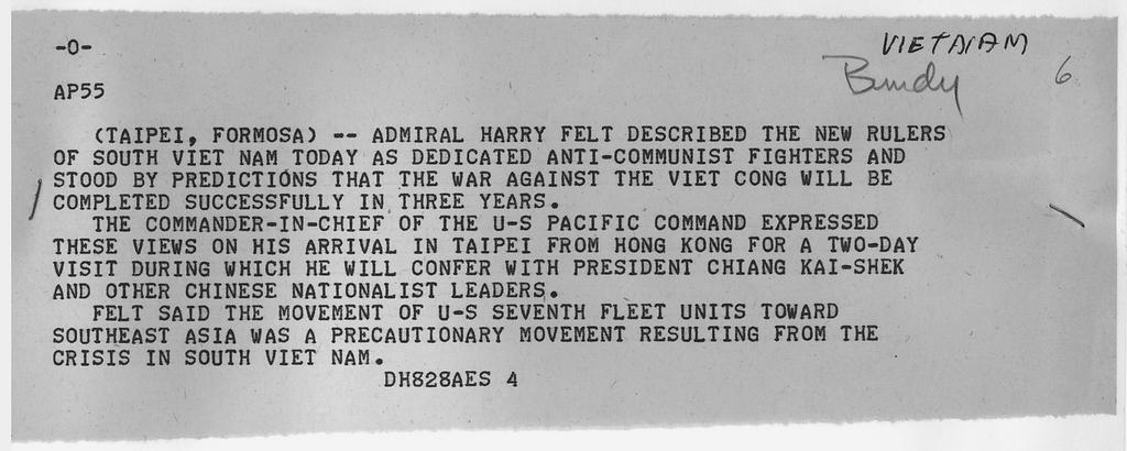 Keywords: Associated Press Wire Report on Statement by Admiral Felt - NARA - 193705.tif Scope and content Associated Press report on statement by Admiral Harry Felt concerning the new rulers in Vietnam General notes 193705 Local identifier President 1961-1963 Kennedy Office of the Personal Secretary 1961 - 1963 John F Kennedy Library NLJFK Columbia Point Boston MA 02125-3398 ca 08/1963 Record group Collection JFK-POF Papers of John F Kennedy President's Office Files 01/20/1961 - 11/22/1963 Record group ARC 1166 Papers of President Kennedy President's Office Files Countries compiled 01/20/1961 - 11/22/1963 Series ARC 193654 File unit Papers of President Kennedy President's Office Files Countries Vietnam General 1963 1963 - 1963 File unit ARC 193703 Variant control numbers NAIL Control Number NLK-POF-CNTRYS-VTNMGNRAL1963-APWIRERPTVTNAMA yes Other versions NARA-cooperation PD-USGov Documents in English |