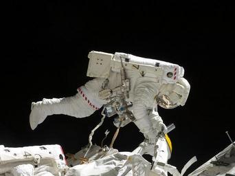 Keywords: astronaut spacewalk iss tools suit pack tether floating international space station