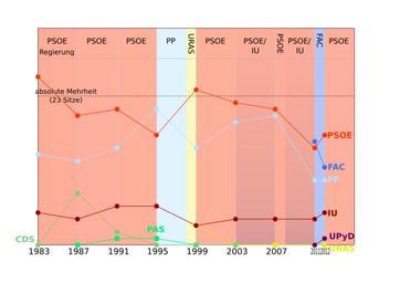 Keywords: Asturparlhist.svg es Junta General des Asturias - Escaños de Regionalparlament Asturien - Sitzverteilung seit 1983 own Marnal 2011-10-14 Cc-zero Politics of Asturias