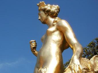Keywords: atalante statue arcadian schwetzingen golden sculpture goddess naked woman female nude body shiny outdoors decorative