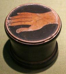 Keywords: Athens Pyxis depicting a hand.jpg Athens century 4 BC clay Institution National Museum Warsaw 0 accession number 142352 object history ProvenanceEvent 1941 transfer National Museum in Warsaw Gołuchów Castle credit line own Cc-zero DEFAULTSORT -0301-0400; Pyxis depicting a hand Ancient Greek pottery in the National Museum in Warsaw Ancient Greek pottery pyxides Attic red-figure pottery 4th-century BC pottery Hands in art
