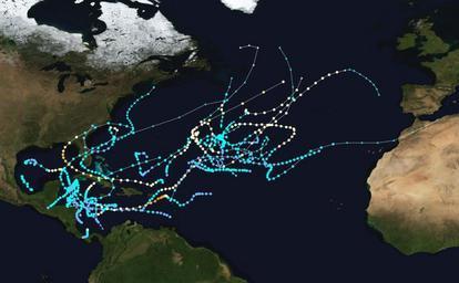 | Keywords: Atlantic November hurricanes BMNG.png right border 0 cellspacing 0 cellpadding 0 style background transparent;text-align center - 7 nowrap nowrap <small>Saffir-Simpson Hurricane Scale</small> - background-color 5ebaff;width 1 8em title Tropical Depression 0 “38 mph 0 “62 km/h TD background-color 00faf4;width 1 8em title Tropical Storm 39 “73 mph 63 “117 km/h TS background-color ffffcc;width 1 8em title Category 1 74 “95 mph 119 “153 km/h 1 background-color ffe775;width 1 8em title Category 2 96 “110 mph 154 “177 km/h 2 background-color ffc140;width 1 8em title Category 3 111 “130 mph 178 “209 km/h 3 background-color ff8f20;width 1 8em title Category 4 131 “155 mph 210 “249 km/h 4 background-color ff6060;width 1 8em title Category 5 > 156 mph > 250 km/h 5 This map shows the tracks of all Atlantic hurricanes which formed in November between 1950 and 2005 The points show the locations of the storms at six-hourly intervals and use the color scheme shown to the right from Saffir-Simpson Hurricane Scale The background image is derived from the November Blue Marble Next Generation Created using User jdorje/Tracks by Nilfanion on 2006-08-05 http //visibleearth nasa gov/view_rec php id 7134 Background image from NASA Tracking data for storms is from the National Hurricane Center http //www nhc noaa gov/pastall shtml Cumulative Atlantic hurricane trackmaps Atlantic November |