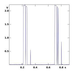 | Keywords: ATmega8 ADC sampled “knocks” at 450 Hz rate.svg ADC at 450 Hz sampling rate The signal was picked up with a piezoelectric buzzer shunted with a 680 kΩ resistor used as a microphone and passed through an LM358-based unity gain amplifier for impedance matching reasons Own Ivan Shmakov 2014-06-08 <gallery mode packed > ATmega8 ADC sampled knocks at 450 Hz rate directly svg </gallery> ATmega8 Piezoelectricity Cc-zero | ||||
