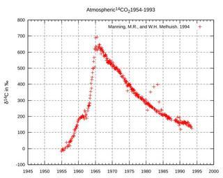 | Keywords: Atmospheric radiocarbon 1954-1993.svg An improved version of this plot is available as Image Radiocarbon bomb spike svg gnuplotted data of atmospheric radiocarbon in Wellington New Zealand 1954AD to 1993AD The SVG file from gnuplot has been improved manually ;Data source Manning M R and W H Melhuish 1994 Atmospheric 14C record from Wellington In Trends A Compendium of Data on Global Change Carbon Dioxide Information Analysis Center Oak Ridge National Laboratory U S Department of Energy Oak Ridge Tenn U S A ;URL http //gcmd gsfc nasa gov/records/GCMD_CDIAC_C14_WELLINGTON html http //cdiac esd ornl gov/trends/co2/welling htm All rights for generating the graphics shall be released As far as I know there is no copyright protection on measurement data in general Gnuplot diagrams Carbon-14 |