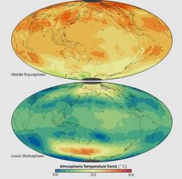 | Keywords: Atmospheric Temperature Trend.jpg These images show temperature trends in two thick layers of the atmosphere as measured by a series of satellite-based instruments between January 1979 and December 2005 The top image shows temperatures in the middle troposphere centered around 5 kilometers above the surface The lower image shows temperatures in the lower stratosphere centered around 18 kilometers above the surface Oranges and yellows dominate the troposphere image indicating that the air nearest the Earth ™s surface warmed during the period The stratosphere image is dominated by blues and greens indicating cooling other versions PD-USGOV-NASA NASA Official website http //earthobservatory nasa gov/IOTD/view php id 7839 PD-USGov-NASA PD-USGov Original upload log page en wikipedia Atmospheric+Temperature+Trend jpg wikitable - 2014-01-28 11 28 12 610× 600× LollyBear12 These images show temperature trends in two thick layers of the atmosphere as measured by a series of satellite-based instruments between January 1979 and December 2005 The top image shows temperatures - Uncategorized 2016 November 5 Uploaded with MTC |