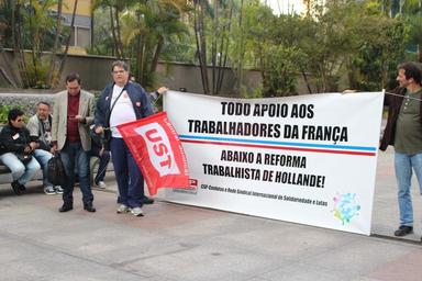 | Keywords: Ato realizado em frente ao consulado geral da França, em apoio aos trabalhadores franceses em luta contra a reforma nas leis trabalhistas. As intervenções também denunciaram perseguições e criminalização de ativistas de diversos países.