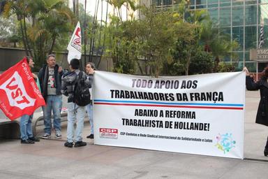 | Keywords: Ato realizado em frente ao consulado geral da França, em apoio aos trabalhadores franceses em luta contra a reforma nas leis trabalhistas. As intervenções também denunciaram perseguições e criminalização de ativistas de diversos países.