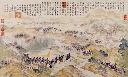 | Keywords: Attack on Douliumen (Zhuluo).jpg zh 清乾隆 平定臺灣得 之 大剿諸賊開 諸羅並 攻斗六 en A scene of the Taiwanese campaign 1787-1788 http //www battle-of-qurman com cn/e/hist htm late XVIII century A collaboration between Chinese and European painters The Jesuit missionaries involved in producing the drawings in China were Giuseppe Castiglione Jean-Denis Attiret Ignace Sichelbart and Jean Damascene The engravings were executed in Paris under the direction of Charles-Nicolas Cochin of the Académie Royal at the Court of Louis XVI and the individual engravers include Le Bas Aliamet Prevot Saint-Aubin Masquelier Choffard and Launay PD-Art Military of Qing China Ten Great Campaigns Paintings of the Qing Dynasty |