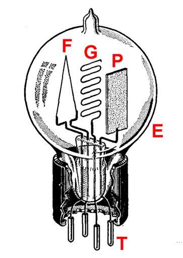 Keywords: Audion vacuum tube construction.png Audion the first triode vacuum tube invented in 1906 by Lee De Forest Part of the tube base is shown removed to reveal the terminals The parts are F - Cathode consisting of a U-shaped platinum wire filament heated to incandescence by a current G - Grid consisting of a 25 mil nickel wire in a zigzag shape P - Plate anode electrode consisting of 9/16 in square of 5 mil sheet nickel E - Evacuated sealed glass envelope In later vacuum tubes this was evacuated to 10<sup>-9</sup> atmosphere In the Audion some gas was deliberately left in the tube T - Terminal pins plugged into a socket to connect the tube to the external circuit The filament in vacuum tubes eventually burned out so they had to be replaced periodically The spacing between the filament grid and plate in the drawing is exaggerated for clarity; in actual tubes the elements were only about 1 millimeter apart Alterations to image Removed existing labels and replaced them with red labels 1952 Retrieved 17 October 2013 from http //www tubebooks org/Books/intro_army_theory pdf Basic Theory and Application of Electron Tubes US Dept of the Army Technical Manual TM 11-662 February 1952 p 4 fig 4 on Pete Miller's http //www tubebooks org/index html tubebooks org website K E Thiebaud PD-USGov Uploaded with UploadWizard Audion Vacuum triodes |