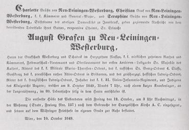 | Keywords: August Georg zu Leiningen TodesanzeigeJS.jpg August Georg zu Leiningen-Westerburg-Neuleiningen Todesanzeige self-made own scan from own old paper from 1849 2009-11-17 Joachim Specht August Georg zu Leiningen-Westerburg-Neuleiningen People of Grünstadt Death notice 1849 obituaries |