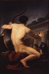 | Keywords: Augustin Van den Berghe - De naakte krijger.jpg Artwork Augustin Van den Berghe Belgium 1756-1836 formerly attributed to 1780 - 1790 oil on canvas cm 128 7 192 Institution Groeningemuseum accession number GRO0134 I object history langSwitch via een onbekende herkomst in het museum van de Brugse academie in 1892 overgedragen transmitted through an unknown source in the museum of Bruges academy in 1892 credit line De Naakte krijger is net als de Heilige Sebastiaan een typisch academisch werk Het monumentale schilderij toont een op de rug geziene naakte man met boog schild en pijlenkoker Gezien deze attributen wordt soms verondersteld dat de man geïdentificeerd kan worden met de soldaat die Sebastiaan met zijn pijlen doorboorde De zeer bewogen lichaamshouding is rechtstreeks gebaseerd op het antieke Torso Belvedère in het Vatikaan Net als de Heilige Sebastiaan is dit werk niet door Suvée geschilderd maar door zijn leerling Augustin van den Berghe Hij maakte deze kopie waarschijnlijk tijdens zijn leertijd bij de meester in Parijs <ref>http //www vlaamsekunstcollectie be/collection aspx p 0848cab7-2776-4648-9003-25957707491a inv 0000 GRO0134 I vlaamsekunstcollectie be</ref> reflist http //www lukasweb be/en/photo/nude-man Lukas - Art in Flanders VZW PD-art-100 Augustin Van den Berghe Paintings in Groeningemuseum Paintings of nude males |