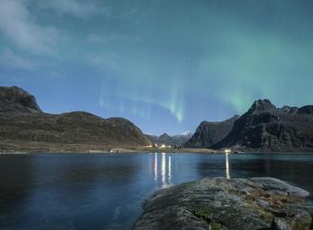 Keywords: aurora borealis lofoten norway night beach costa winter blue green auroras boreal