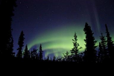 Keywords: aurora borealis northern lights sky night landscape nature dark colorful bright hills silhouettes tranquil skyline trees