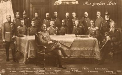| Keywords: Aus grosser Zeit.jpg Kaiser Wilhelm II und Officiere während des Ersten Weltkriegs German emperor Wilhelm II with a collection of top German officers during the great war world war one ; contemporary German postcard Picture source the collection of Fredrik Tersmeden Lund Sweden PD-old Military people of the German Empire World War I postcards of German Empire Generals of Germany 1915 Wilhelm II of Germany in 1915 191507 Karl von Bülow 191507 August von Mackensen 191507 Rupprecht Crown Prince of Bavaria 191507 Helmuth Johannes Ludwig von Moltke 191507 Albrecht Duke of Württemberg 191507 William German Crown Prince 191507 Alexander von Kluck 191507 Hermann von François 191507 Erich Ludendorff 191507 Albert Theodor Otto von Emmich 191507 Erich von Falkenhayn 191507 Karl von Einem 191507 Gottlieb Graf von Haeseler 191507 Hans Hartwig von Beseler 191507 Paul von Hindenburg 191507 Theobald von Bethmann Hollweg 191507 Josias von Heeringen 191507 Alfred von Tirpitz 191507 |