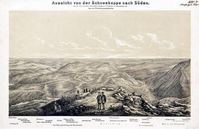 | Keywords: Aussicht von der Schneekoppe nach Süden.jpg Artwork Creator Ernst Wilhelm Knippel langSwitch View from Snežka on the four corners of the world - South Aussicht von der Schneekoppe auf die vier Ecken der Welt - Süd Vue depuis Snežka sur les quatre coins du monde - Sud Widoki ze Sniezki na cztery strony swiata - Poludnie between 1840 1855 lithography cm 27 7 41 7 Muzeum Karkonoskie w Jeleniej Górze http //jbc jelenia-gora pl/Content/1042/mjg_ah_6058 jpg Cyfrowy Dolny Slask other versions <gallery> Aussicht von der Schneekoppe nach Norden jpg LangSwitch North Nord default Aussicht von der Schneekoppe nach Osten jpg LangSwitch East Ost Est default Aussicht von der Schneekoppe nach Westen jpg LangSwitch West West Ouest default </gallery> other fields Information field LangSwitch Legend Bildtext Légende default LangSwitch Top middle Oben Mitte Haut milieu default Aussicht von der Schneekoppe nach Süden <br /> LangSwitch Below Darunter Plus bas default Nach der Natur gezeichnet Lithographie Verlag von E W Knippel in Schmiedeberg i/ Schl <br /> LangSwitch Below Darunter Plus bas default Gegen jede Nachahmung gesetzlich geschützt <br /> LangSwitch Below the picture f l t r Unter dem Bild v l n r Sous l'image de g à dr default Schneeberg ; Tabor bei Königinhof ; Gitschin ; Troska <br /> LangSwitch Below f l t r Darunter v l n r Plus bas de g à dr default Rehorngebirge ; Trautenau ; Schwarze Berg ; Schwarzschlagbauden ; Fuchsbauden ; Fuchsberg ; Richterbauden ; Teufelsgärtchen ;<br /> LangSwitch Below f l t r Darunter v l n r Plus bas de g à dr default Dörrengrund ; Jungbuch ; Freiheit ; Tippelbauden ; Tammbauden ; Schröfelbauden ; Stufenseite ; Lenzenbauden ; Berauerberg ; Brunnenberg ;<br /> LangSwitch Below f l t r Darunter v l n r Plus bas de g à dr default Langenberg ; Gross-Aupa ; Spitzberg ; Leischnerbauden ; Bantenplan ;<br /> LangSwitch Below f l t r Darunter v l n r Plus bas de g à dr default Die Kugeln ; Oestr Telegraphenleitung nach Marschendorf ; Rosenberg ; Riesengrund ; Weg in den Riesengrund ; Belichtung Farbe und Kontrast der Bildserie Nord- Süd- Ost- und Westaussicht an einander angeglichen; Retusche Artefakte und kleine Bildbeschädigungen verringert Bildzuschnitt Vielfaches von 16px ; Photoshop Speicheroptionen Qualität 12 MagentaGreen PD-old-auto-1923 1900 Snežka Krkonoše History of Sněžka Ernst Wilhelm Knippel 1840s lithographs |