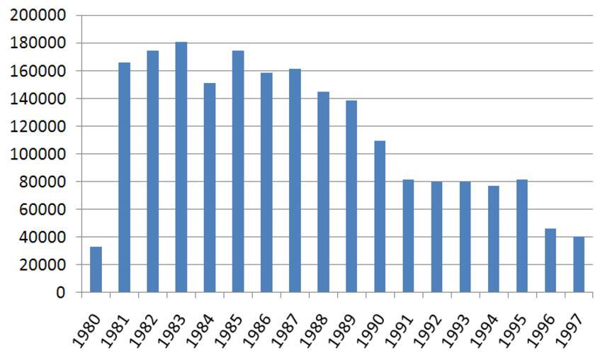| Keywords: Austin-MG Metro, Rover Metro & Rover 100 production.png en Chart showing Austin/MG Metro Rover Metro and Rover 100 production from 1980 to 1997 it Grafico che mostra la produzione di Austin/MG Metro Rover Metro e Rover 100 dal 1980 al 1997 own based on figures from http //www aronline co uk/blogs/2011/08/25/history-production-figures/ aronline co uk Alessandro Antonelli 2010-05-17 Rover Metro - Rover 100 production png wikitable + Figures Year Production - 1980 32954 - 1981 165745 - 1982 174666 - 1983 180763 - 1984 150917 - 1985 174666 - 1986 158546 - 1987 161285 - 1988 144701 - 1989 138751 - 1990 109605 - 1991 81422 - 1992 79600 - 1993 79677 - 1994 76821 - 1995 81782 - 1996 46118 - 1997 40199 cc-zero Bar charts Austin/MG/Rover Metro/100 |