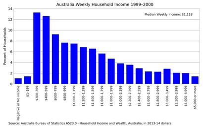| Keywords: Australia household income 2000.svg en Weekly household income distribution of Australia in 1999-2000 Data from Australian Bureau of Statistics http //www abs gov au/AUSSTATS/abs nsf/DetailsPage/6523 02013-14 Household Income and Wealth 2016-06-17 own Delphi234 other versions cc-zero Income distribution in Australia |