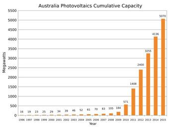 | Keywords: Australia Photovoltaics Installed Capacity.svg translate yes en Cumulative installed photovoltaics in Australia from 1996 to 2015 Sources 2014 http //www iea-pvps org/fileadmin/dam/public/report/technical/PVPS_report_-_A_Snapshot_of_Global_PV_-_1992-2014 pdf 2015 http //www iea-pvps org/fileadmin/dam/public/report/PICS/IEA-PVPS_-__A_Snapshot_of_Global_PV_-_1992-2015_-_Final_2_02 pdf 2014-12-01 own Delphi234 other versions cc-zero Solar energy in Australia Photovoltaic power statistics | ||||