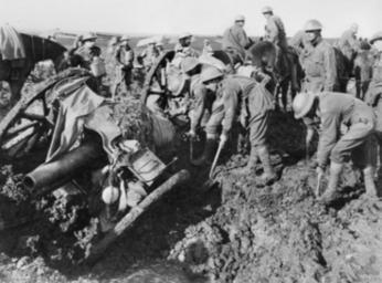 | Keywords: Australian4.5inchHowitzerHannebeek4October1917.jpeg AWM caption Members of the Australian 1st Division Pioneers digging out a gun belonging to the 104 Howitzer Battalion sic presumably this should be 104 Howitzer Battery which was trying to haul their gun forward after the advance near Hannebeek in the Ypres Sector <p>Identified are Sergeant Sgt J Howell leaning on a shovel behind the Howitzer second from the left Private Sadler centre foreground beside the Howitzer's wheel Sgt Pallbrook standing behind Sadler Lieutenant McCullagh or O'Toole extreme right smoking pipe <p>The gun is a QF 4 5 inch Howitzer <br>See Battle of Broodseinde E01076 1917-10-04 Frank Hurley Copyright clear Australian Government copyright expired PD-AustraliaGov File 1st Division Pioneers dig out howitzer 1917 Flickr 2867494012 523ed879d3 o jpg QF 4 5 inch Howitzer Battle of Broodseinde World War I forces of Australia in Belgium World War I Photographs by Frank Hurley People with shovels Digging Black and white photographs of Belgium |