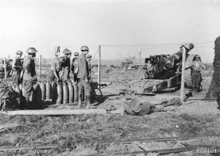 | Keywords: Australian8inchHowitzerCrewYpres17September1917.jpeg An 8 inch howitzer of the Australian Heavy Artillery in action near Gordon Roads The 1st Australian Siege Battery went into action in this position about the 14 September 1917 and remained there until the 26 September 1917 taking part in many heavy bombardments during this short period The map reference is Sheet 28 Edition 3 I 16B and I 17A The Battery was commanded by the late Major McDonald DSO Royal Australian Artillery RAA The light railway in the foreground was used for bringing up ammunition to the Battery <p>Left to right http //deepthought hass adfa edu au 8080/showPerson pid 43927 Gunner Gnr E B Cameron; http //deepthought hass adfa edu au 8080/showPerson pid 246611 Gnr C L Proops foreground ; http //deepthought hass adfa edu au 8080/showPerson pid 5840 Gnr H Andrews leaning over shells ; Gnr Marriott; http //deepthought hass adfa edu au 8080/showPerson pid 322543 Lieutenant W W Whittle RAA background ; http //deepthought hass adfa edu au 8080/showPerson pid 322718 Gnr G W C Whyte; http //deepthought hass adfa edu au 8080/showPerson pid 264612 Gnr J F Ryan foreground ; Gnr E A McRae; Gnr E Pearce beside gun ; Sergeant W Jones lying on ground in foreground E02101 1917-09-17 Photographer Unknown probably Frank Hurley Copyright clear PD-AustraliaGov BL 8 inch Howitzer Mk VI - VIII World War I forces of Australia in Belgium Trench railways Black and white photographs |