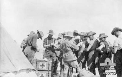 | Keywords: Australian 21st Battalion innoculation parade Egypt 1915 AWM photo A00752.jpg en Photograph taken at Heliopolis Egypt North Africa on 29 August 1915 Members of the 21st Battalion in line waiting to be vaccinated against cholera prior to leaving for Gallipoli Captain later Major Joseph Patrick Fogarty later awarded MC and OBE Regimental Medical Officer centre of the Battalion is giving the injection Medical boxes are being used as a table for their equipment Joseph Patrick Joe Fogarty 1887-1954 also played VFL football with South Melbourne Essendon and University for a total of 16 games From the collection of the Australian War Museum A00752 Anonymous photographer 29 August 1915 Heliopolis North Africa Egypt North Africa PD-Australia PD-US-1996 watermark Images from the Australian War Memorial Black and white photographs History of Australian rules football Players of Essendon Football Club Players of Sydney Swans 1915 in Egypt Heliopolis Cairo suburb Military medicine in Egypt |