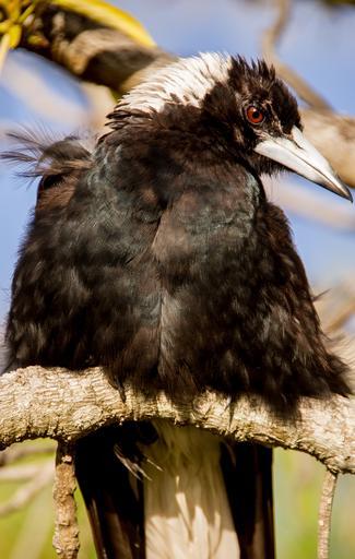 Keywords: australian magpie magpie bird black white feathers perching tree closeup wild queensland australia