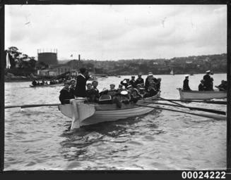 | Keywords: samuel j hood collection samueljhoodcollection sydney harbour sydneyharbour australian sea cadets australianseacadets regatta royal sydney yacht squadron royalsydneyyachtsquadron sailing club sailingclub sailing sailing boat sailingboat royal australian navy royalaustraliannavy kirribilli blackandwhite monochrome photo border outdoor black and white The Royal Sydney Yacht Squadron is a private sailing club which was formed in 1862. This glass plate negative depicts a large group of uniformed Australian Sea Cadets (also formally known as Naval Reserve Cadets and now known as the Australian Navy Cadets) in an open boat near the Squadron's headquarters in Kirribilli. In the background to the left, a whale's jawbones are visible and form an archway to the Squadron's main building. The jawbones originally came from a whaling station at Twofold Bay, on the south coast of New South Wales. This photo is part of the Australian National Maritime Museum’s Samuel J. Hood Studio collection. Sam Hood (1872-1953) was a Sydney photographer with a passion for ships. His 60-year career spanned the romantic age of sail and two world wars. The photos in the collection were taken mainly in Sydney and Newcastle during the first half of the 20th century. The ANMM undertakes research and accepts public comments that enhance the information we hold about images in our collection. This record has been updated accordingly. Photographer: Samuel J. Hood Studio Collection Object no. 00024222 The Royal Sydney Yacht Squadron is a private sailing club which was formed in 1862. This glass plate negative depicts a large group of uniformed Australian Sea Cadets (also formally known as Naval Reserve Cadets and now known as the Australian Navy Cadets) in an open boat near the Squadron's headquarters in Kirribilli. In the background to the left, a whale's jawbones are visible and form an archway to the Squadron's main building. The jawbones originally came from a whaling station at Twofold Bay, on the south coast of New South Wales. This photo is part of the Australian National Maritime Museum’s Samuel J. Hood Studio collection. Sam Hood (1872-1953) was a Sydney photographer with a passion for ships. His 60-year career spanned the romantic age of sail and two world wars. The photos in the collection were taken mainly in Sydney and Newcastle during the first half of the 20th century. The ANMM undertakes research and accepts public comments that enhance the information we hold about images in our collection. This record has been updated accordingly. Photographer: Samuel J. Hood Studio Collection Object no. 00024222 |