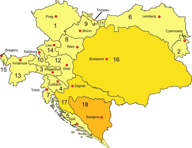 | Keywords: Austria-Hungary map de.svg <u>Österreich-Ungarn 1910</u> Cisleithanien 1 Böhmen 2 Bukowina 3 Kärnten 4 Krain 5 Dalmatien 6 Galizien 7 Küstenland 8 Österreich unter der Enns 9 Mähren 10 Salzburg 11 Schlesien 12 Steiermark 13 Tirol 14 Österreich ob der Enns 15 Vorarlberg; Transleithanien 16 Ungarn 17 Kroatien und Slawonien; Kondominium 18 Bosnien und Herzegowina <u>Ausztria “Magyarország</u> Osztrák Császárság Ciszlajtánia 1 Csehország 2 Bukovina 3 Karintia 4 Krajna 5 Dalmácia 6 GalÃcia 7 Tengermellék 8 Alsó-Ausztria 9 Morvaország 10 Salzburg 11 Szilézia 12 Stájerország 13 Tirol 14 FelsÅ‘-Ausztria 15 Vorarlberg; Magyar Királyság Transzlajtánia 16 Magyarország 17 Horvát-Szlavónország; osztrák “magyar kondomÃnium 18 Bosznia és Hercegovina <u>Austria-Hungaria</u> Cisleithania 1 Bohemia 2 Bucovina 3 Carinthia 4 Carniola 5 Dalmatia 6 Galicia 7 Litorale 8 Austria Inferior 9 Moravia 10 Salisburgum 11 Silesia 12 Styria 13 Tirolis 14 Austria Superior 15 Cisarulana; Transleithania 16 Hungaria 17 Croatia et Slavonia Condominium 18 Bosnia et Herzegovina <u>Austro “WÄ™gry</u> Cesarstwo Austrii Przedlitawia 1 Czechy 2 Bukowina 3 Karyntia 4 Kraina 5 Dalmacja 6 Galicja i Lodomeria 7 Pobrzeże 8 Austria przed AnizÄ… 9 Morawy 10 Salzburg 11 ÅšlÄ…sk Austriacki 12 Styria 13 Tyrol 14 Austria za AnizÄ… 15 Vorarlberg; Królestwo WÄ™gier Zalitawia 16 WÄ™gry 17 Chorwacja; BoÅ›nia 18 BoÅ›nia i Hercegowina <u>Austria “Hungary</u> Empire of Austria Cisleithania 1 Bohemia 2 Bukovina 3 Carinthia 4 Carniola 5 Dalmatia 6 Galicia 7 Küstenland 8 Lower Austria 9 Moravia 10 Salzburg 11 Silesia 12 Styria 13 Tyrol 14 Upper Austria 15 Vorarlberg; Kingdom of Hungary Transleithania 16 Hungary proper 17 Croatia-Slavonia; Austrian-Hungarian Condominium 18 Bosnia and Herzegovina Austria-Hungary_map svg 2011-05-24 Austria-Hungary_map svg IMeowbot derivative work Furfur <span class signature-talk >talk</span> Deutsche à bersetzung/German translation Furfur Austria-Hungary_map svg PD-user-w Original upload log This image is a derivative work of the following images File Austria-Hungary_map svg licensed with PD-user-w 2011-02-03T16 44 20Z Vearthy 783x605 339358 Bytes <nowiki>Kingdom of Hungary back in green changed too strong orange to a bit lighter pastel color</nowiki> 2010-04-16T22 48 32Z Vearthy 783x605 339320 Bytes <nowiki>changed colours</nowiki> 2009-09-14T22 49 21Z Kirk 783x605 338680 Bytes <nowiki>english names of capitals</nowiki> 2009-09-14T22 41 55Z Kirk 783x605 338634 Bytes <nowiki>correctioons</nowiki> 2009-08-09T21 00 32Z Gugganij 783x605 322419 Bytes <nowiki>Reverted to version as of 19 00 24 July 2009 reason the province Küstenland was blackened</nowiki> 2009-07-25T22 13 52Z Cäsium137 800x640 280574 Bytes <nowiki>Valid IDs</nowiki> 2009-07-24T23 41 46Z Cäsium137 800x640 280239 Bytes <nowiki>smooth</nowiki> 2009-07-24T19 00 43Z Hk kng 783x605 322419 Bytes <nowiki>a bit of cleanup</nowiki> 2009-07-24T18 32 00Z Hk kng 783x605 326688 Bytes <nowiki>testing whether using another font helps</nowiki> 2009-07-24T09 46 45Z NordNordWest 783x605 326543 Bytes <nowiki>Reverted to version as of 05 20 30 March 2007</nowiki> 2009-07-24T09 36 23Z Zsoni 776x600 2107 Bytes <nowiki>Korrektur </nowiki> 2007-03-30T05 20 57Z W B 783x605 326543 Bytes <nowiki>syntax cleanup groups named ids sorted </nowiki> 2006-06-28T23 01 58Z Neoneo13 783x605 243229 Bytes <nowiki>Taken from english Wikipedia Created by user IMeowbot </nowiki> Uploaded with derivativeFX Austria in the 19th century Maps of Austria-Hungary SVG maps showing history in German |