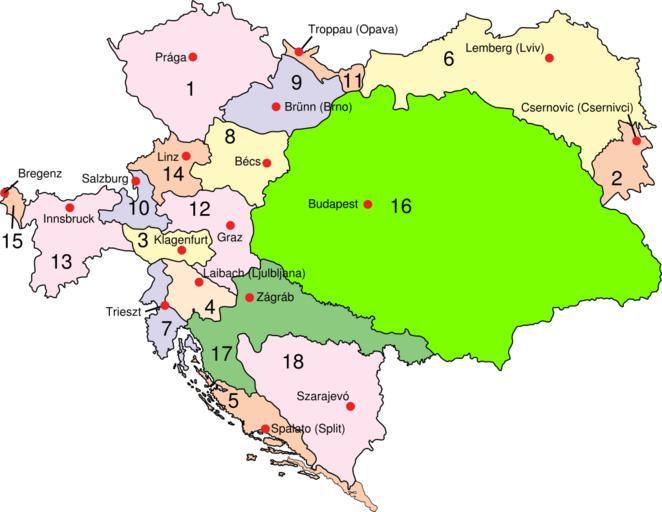 | Keywords: Austria-Hungary map hu.svg Austria-Hungary 1910 Cisleithania 1 Bohemia 2 Bukovina 3 Carinthia 4 Carniola 5 Dalmatia 6 Galicia 7 Austrian Littoral 8 Lower Austria 9 Moravia 10 Salzburg 11 Silesia 12 Styria 13 Tirol 14 Upper Austria 15 Vorarlberg; Transleithania 16 Hungary 17 Croatia and Slavonia; 18 Bosnia and Herzegovina Austria-Hungria 1910 Cisleitania 1 Bohemia 2 Bucovina 3 Carintia 4 Carniola 5 Dalmacia 6 Galitzia 7 Litoral austriaco 8 Austria baja 9 Moravia 10 Salzburgo 11 Silesia 12 Estiria 13 Tirol 14 Austria superior 15 Vorarlberg; Transleitania 16 Hungria 17 Croacia y Eslavonia; 18 Bosnia y Herzegovina Österreich-Ungarn 1910 Cisleithanien 1 Böhmen 2 Bukowina 3 Kärnten 4 Krain 5 Dalmatien 6 Galizien 7 Küstenland 8 Österreich unter der Enns 9 Mähren 10 Salzburg 11 Schlesien 12 Steiermark 13 Tirol 14 Österreich ob der Enns 15 Vorarlberg; Transleithanien 16 Ungarn 17 Kroatien und Slawonien; 18 Bosnien und Herzegowina Ausztria-Magyarország 1910-ben Ciszlajtánia 1 Bohémia 2 Bukovina 3 Karinthia 4 Krajna 5 Dalmácia 6 Galícia 7 Osztrák tengermellék 8 Alsó-Ausztria 9 Morvaország 10 Salzburg 11 Szilézia 12 Stájerország 13 Tirol 14 Felső-Ausztria 15 Vorarlberg; Transzlajtánia 16 Magyarország 17 Horvát-Szlavónország; 18 Bosznia és Hercegovina Austria-Hungary_map svg 2008-10-30 10 13 UTC derivative work Winston01 <span class signature-talk >talk</span> Austria-Hungary_map svg IMeowbot Hungarian translation of city names Winston Austria-Hungary_map svg PD-user-w original upload log This image is a derivative work of the following images Image Austria-Hungary_map svg licensed with PD-user-w 2007-03-30T05 20 57Z W B 783x605 326543 Bytes <nowiki>syntax cleanup groups named ids sorted </nowiki> 2006-06-28T23 01 58Z Neoneo13 783x605 243229 Bytes <nowiki>Taken from english Wikipedia Created by user IMeowbot </nowiki> Uploaded with derivativeFX SVG maps in Hungarian Maps of Austria-Hungary |