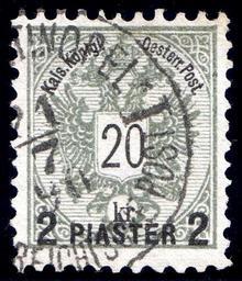| Keywords: Austria Levant 1888 Sc18.jpg en Postage stamp of the Austro-Hungarian Empire for usage by Levant post offices 2 Piaster on 20 Kreuzer grey used in Constantinopel Catalogue Sc 18 Mi 18 Valid for postage to 30 6 1891 1888 Scan of original Austro-Hungarian postal authorities PD-old 1888 stamps Austrian post offices in the Ottoman Empire Double-headed eagles on stamps Animals on stamps to be categorised by country | ||||