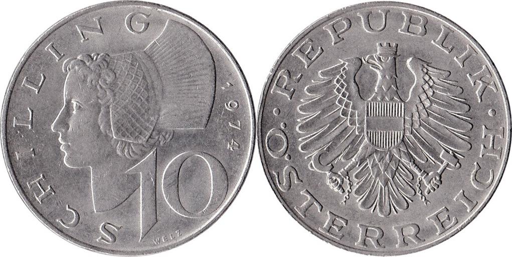 Keywords: Austria S010 1974.jpg en Coin from Austria - 10 schilling 1974 2016-03-25 own Awmcphee other versions cc-zero Coins of Austria 1945-2001