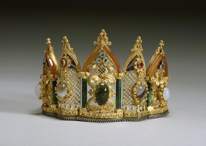 Keywords: Austrian - Gothic-Style Bracelet - Walters 571999.jpg This extravagant bracelet consists of five arched segments and three foliate segments Judging from indentiations in the original leather case this piece was originally a diadem with two additional foliate elements rather than a bracelet All the pieces are hinged together and carried out in elaborate openwork decorated with precious stones and scrollwork The five large segments imitate Gothic architecture with ogive arches and columns ca 1870 gold carnerlian malachite moss agate amethysts aquamarines rubies cm 6 99 accession number 57 1999 22276 Private collection Austria Felix Laurence Paris Raphael Esmerian New York Walters Art Museum Gift in memory of Paul Esmerian 1972 Jewelry - Ancient to Modern The Walters Art Gallery Baltimore 1979-1980 Objects of Adornment Five Thousand Years of Jewelry from the Walters Art Gallery Baltimore Cooper-Hewitt National Design Museum New York; Chrysler Museum of Art Norfolk; Carnegie Museum of Art Pittsburgh; San Antonio Museum of Art San Antonio; Philbrook Museum of Art Tulsa; Honolulu Academy of Arts Honolulu; New Orleans Museum of Art New Orleans; Milwaukee Art Museum Milwaukee; Minneapolis Institute of Arts Minneapolis; Toledo Museum of Art Toledo; The John and Mable Ringling Museum of Art Sarasota 1984-1987 Jewelry from the Walters Art Museum and the Zucker Family Collection The Walters Art Gallery Baltimore 1987 Bedazzled 5 000 Years of Jewelry from the Walters Art Museum Frist Center for the Visual Arts Nashville; The John and Mable Ringling Museum of Art Sarasota; The Walters Art Museum Baltimore 2006-2009 Bedazzled 5 000 Years of Jewelry El Paso Museum of Art El Paso 2010 place of origin Austria Walters Art Museum license Jewellery in the Walters Art Museum Jewellery of Austria Gothic revival in Austria Gothic revival jewellery |