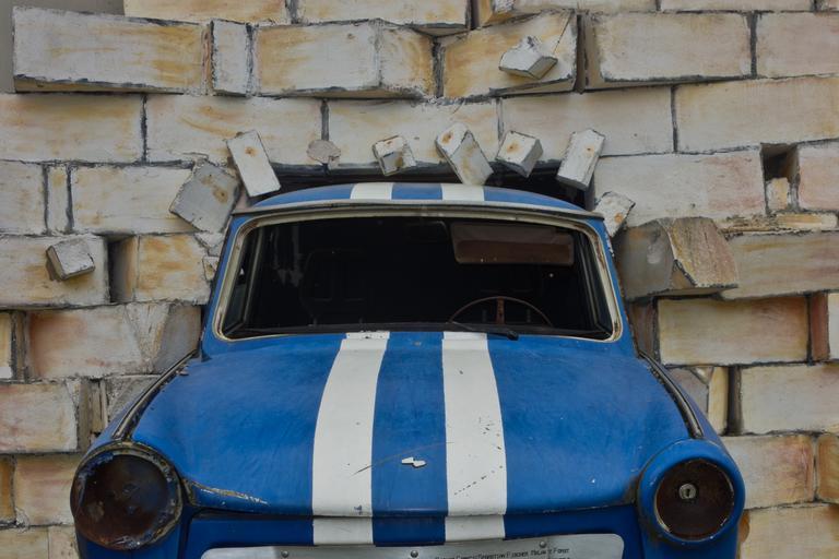 Keywords: auto trabbi wall accident sculpture art satellite light blue ddr