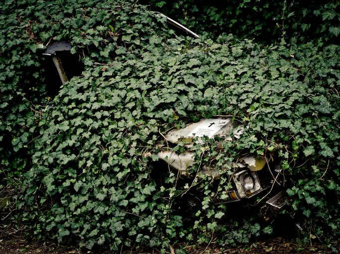 Keywords: auto wreck scrap oldtimer old broken vehicle rusted overgrown ivy turned off cadillac