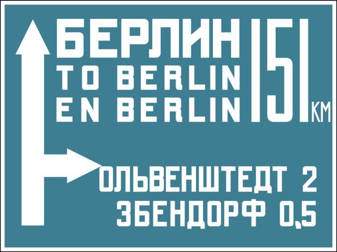 | Keywords: Autobahnausfahrt-Vorwegweiser, nach einem Photo von 1945.svg de Autobahnausfahrt-Vorwegweiser zur Abfahrt Olvenstedt “ Ebendorf nach einem Photo von 1945 Das Originalphoto ist schwarz-weiß doch aufgrund der mit anderen Schwaz-Weiß-Photos vergleichbaren Tönung die tatsächlich den sehr dunklen Originalfarbton 32 h nach der RAL-Farbkarte 840 b2 besitzen wurde dieses Schild in einem helleren höchstwahrscheinlich auch bläulichen Farbton angefertigt Für diesen Farbton wurde von mir in einem Blau gewählt wie er mir von wenigen vergleichbaren Farbphoto-Nachkriegsaufnahmen her bekannt ist Der hellere Ton könnte durch Streckung der Originalfarbe mit billigeren Zuschlagstoffen zustande gekommen sein wie dies bereits während der Kriegs-Mangelwirtschaft praktiziert wurde oder es war den Verantwortlichen kurz nach Kriegsende egal welcher Blauton den Vorschriften entsprach own gezeichnet von Mediatus Mediatus 11 November 2015 Herstellungsdatum Other fields + Signs Cc-zero PD-VzKat Diagrams of direction road signs of Germany Diagrams of motorway road signs of Germany 1945 set |