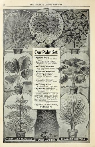 | Keywords: Autumn 1900 (16316548909).jpg 30 <br> THE DINGEE CONARD COMPANY <br> Our Palm Set <br> i Boston Fern <br> The best of all Ferns 20 cts <br> each <br> i Latania Bortoonica <br> Handsome and quick growing <br> 20 cts each <br> i 'Weeping Lantana <br> Well known and popular 15 <br> cts each <br> i Grevillea Robusta <br> Beautiful 15 cts each <br> i Carex Japonica <br> Unique and graceful 15 cts <br> each <br> i ©taneite Orange <br> Champion pot plant 15 cts <br> each <br> i 'Weeping Palm <br> A grand variety 15 cts each <br> i Dracaena Indivisa <br> Superb decorative plant 15 <br> cts each <br> SPECIAL OFFER ” One each of <br> abdbe-named olants eight in all <br> large strong ihree-inch-vot plants <br> for 1 00 postage paid This is a <br> superb offer' of the finest decorative <br> plants in existence <br> Address <br> THE DINGEE CONARD CO <br> West Grove Pa <br> iF <br> GREVILLEA ROBUSTA' OlTcAREX JAPONICA DRACAENA IHDIV1SA- 43803688 149033 77852 Page 30 Text http //www biodiversitylibrary org/page/43803688 1900 10 5962/bhl title 77852 Dingee Conard Co ; Henry G Gilbert Nursery and Seed Trade Catalog Collection NameFound Carex NameConfirmed Carex sect Hirtae Tuck ex Kük EOLID 29129 NameFound Dracaena NameConfirmed Dracaena Daudin 1802 EOLID 83827 NameFound Grevillea NameConfirmed Grevillea 'Robyn Gordon' EOLID 60829 NameFound Grevillea robusta NameConfirmed Grevillea robusta EOLID 582736 NameBankID 2651632 NameFound Lantana NameConfirmed Lantana L EOLID 37682 NameBankID 459108 NameFound Latania NameConfirmed Latania EOLID 35120 NameBankID 1850318 NameFound Robusta NameConfirmed Robusta NameBankID 4332975 Biodiversity Heritage Library Autumn 1900 our new guide to rose culture new album Garden Stories Bulbs Plants Catalogs Dingee Conard Co Flowers Nurseries Horticulture Nursery stock Roses Seeds Trade catalogs U S Department of Agriculture National Agricultural Library bhl page 43803688 dc identifier http //biodiversitylibrary org/page/43803688 bhlGardenStories Palms BHLinbloom bulbs plants dingee conard co nurseries horticulture u s department of agriculture national agricultural library bhlgardenstories bhlinbloom Information field Flickr posted date ISOdate 2015-02-11 CC-BY-2 0 BioDivLibrary https //flickr com/photos/61021753 N02/16316548909 2015-08-24 04 51 04 cc-by-2 0 PD-old-70-1923 Autumn 1900 Photos uploaded from Flickr by Fæ using a script |