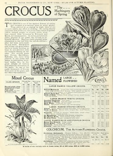 | Keywords: Autumn bulbs catalogue (15829414304).jpg 24 <br> PETKR HENDERSON CO NEW YORK ” BI ' LBS FOR AUTUMN PLANTING <br> CROCUS <br> The <br> Harbing <br> of Spring <br> THE CROCUS is one of the earliest flowers of spring <br> aud occupies a piominent place in everj' garden <br> Wlien planted as an edging in triple lines of one <br> or more colors tlie effect is striking No spring display <br> surpasses that of Crocus ; the broad wavy bands of golden- <br> yellow striped pui p e or of pure white when <br> they expand their blussjonis in February and <br> March are incomparable In lawns and pleasure <br> parks planted in the grass the Crocus is ex- <br> tremely effective They are easily planted indis- <br> criminately in the turf with the aid of a dibber ” <br> after fall rains have made <br> the sod moist The flowers <br> and foliage are gone before <br> the lawn needs mowing so <br> they do not interfere with <br> the summer beauty of the <br> lawn For several years <br> pa t Crocus Snowdrops <br> Daffodils etc have been <br> planted in our parks and <br> lawns in wild places wood- <br> land walks etc to the <br> great delight of visitors <br> and enhanced decoration of <br> the parks In one of the <br> parks thousands of Crocus <br> were used in tlie grass and <br> the effect was matchless <br> Mixed Crocus <br> COLORS SEPARATE <br> Delivered Free i <br> in U S <br> Buyer paying <br> Iransil <br> Blue and purple mixed <br> Variegated and striped <br> White mixed <br> Large yellow Ust size <br> AH colors mixed <br> Doz <br> 10c <br> lOc <br> 10c <br> 12c <br> lOc <br> 100 <br> 60c <br> 60c <br> 60c <br> 75c <br> 55c <br> 100 <br> 45c <br> 45c <br> 4 5c <br> 60c <br> 40c <br> 1 000 <br> 3 50 <br> 3 50 <br> 3 50 <br> 5 00 <br> 3 25 <br> LARGE <br> FLOWERED <br> LARGE NAMED YELLOW CROCUS <br> SeliTcrrd frM Bnjar paying <br> in D S <br> BT«r p»yi <br> Trmsit <br> Tellow Manunotli I nrgp hiillm each producing a nunilxrof i <br> extra l irce pnlden-yplloiv riowprs Thi s variety can almi W \- <br> jirown in Oocns classes dp in ilishes in sand and water <br> Yellow Pirst Size Krijrht vellow <br> Cloth of Gold jolden-yellow stri ied liniwn small flowers I <br> t Ut very profuse ' <br> Doz I 100 <br> -« ¢ l oo <br> 12c <br> 10c <br> LARGE NAMED WHITE CROCUS <br> Caroline Chisholm I'mv white <br> Princess of Wales Siilendid larsre purcnlilte <br> Mont Blanc I rg\ and line while <br> Theba The purest of whites very fn-e-blooniiuc <br> LARGE NAMED STRIPED CROCUS <br> Albion Violet striped lavender ami white extra larjp' flower <br> Cloth of Silver Silvery white striiM'd lilac small flowers <br> hut very profuse <br> Imperati P Iower« in January bluish-white pur le 8trl K' <br> yellow throat sweotly scented <br> La Majestease Imniense white floBers strlpetl Jilar <br> Sir Walter Scott White striped purple extra <br> TSe Plus Ultra ruiple varlc pite l with white <br> LARGE NAMED BLUE AND PURPLE CROCUS <br> Baron Von Dmno y l artre urple <br> David Sizzio I ariie dark purple <br> Garibaldi Extrn larire dark purple <br> Xiilacens Liielit hine extra <br> 12c <br> 1 - c <br> 15c <br> 15c <br> 12r <br> 15r <br> li-ic <br> lac <br> ISc <br> 12c <br> l 'ir <br> ir r <br> li c <br> 100 1 000 <br> 8 5r <br> 60c <br> 75 60r <br> 85 I 70i- <br> 85 <br> 1 00 <br> 85 <br> 83 <br> 75 <br> 85 <br> 85 <br> 85 <br> 70c <br> 70c <br> 70c <br> 60c <br> 85r <br> 70«- <br> 60c <br> 70c <br> 60c <br> 70c <br> 70c <br> 70c <br> 7 50 <br> 5 00 <br> 5 -i0 <br> 6 00 <br> 6 00 <br> 6 0O <br> 6 00 <br> 5 00 <br> 7 50 <br> 6 00 <br> 5 50 <br> 6 00 <br> 5 50 <br> 6 00 <br> 6 00 <br> 6 00 <br> COLCHICUM The Autumn-Flo x ering Crocus <br> Colchicam Antmnnale Meadow Sjiffron l Very elTei'tlve <br> and handsome hanly plants the Howcrsof whichconie tliroU rli <br> the ground wltho\it the leaves In the fjill the leaviw ap H-arlDK <br> the followhiK sprlnK- The flowers comprise many shadi-s of <br> white puri le rosi- striped etc They make lovely borders or <br> marcins to htnls Mixed s irtH <br> J ;j i ~_ Parklasoni \ l enutltul r in- variety from the fin-ek \nhlp«'l- <br> ' – ' ' ago; larije flowers of white tessi'llatiMl and barred witli rose <br> ArTnMX-FLOWERlNd cno I » rxiiKivsoM and purple like M cherker-lionrd very odd s e -i;f i <br> e bulbs of one variety sold at doien rates 25 at lOO pates 250 at l OOO rat«s <br> ; OeliTiTMl free i <br> IB 0 S 1 <br> Bnjer pty ng <br> TrtssiL <br> Eacii Doi i <br> Doi I IN <br> 6c 0 CO <br> 50c i»4 00 <br> <br> UX- ' TOO <br> OOc 7 00 43899736 149965 78524 Page 24 Text http //www biodiversitylibrary org/page/43899736 1900 10 5962/bhl title 78524 Henry G Gilbert Nursery and Seed Trade Catalog Collection ; Peter Henderson Co NameFound Colchicum NameConfirmed Colchicum L EOLID 33203 NameFound I ariie NameFound I nrgp NameFound Theba NameConfirmed Theba EOLID 57947 NameBankID 2688802 Biodiversity Heritage Library Autumn bulbs catalogue 1900 Garden Stories Bulbs Plants Catalogs Equipment and supplies Flowers Gardening Seeds Trade catalogues U S Department of Agriculture National Agricultural Library bhl page 43899736 dc identifier http //biodiversitylibrary org/page/43899736 Peter Henderson Co bhlGardenStories Crocus BHLinbloom bulbs plants u s department of agriculture national agricultural library peter henderson co bhlgardenstories bhlinbloom Information field Flickr posted date ISOdate 2015-02-05 CC-BY-2 0 BioDivLibrary https //flickr com/photos/61021753 N02/15829414304 2015-08-24 23 52 27 cc-by-2 0 PD-old-70-1923 Unidentified Crocus Autumn bulbs catalogue Photos uploaded from Flickr by Fæ using a script |